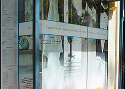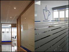 Vinilo de corte Glass y vinilo de corte color corporativo sobre cristalera interna / Señalética decorativa