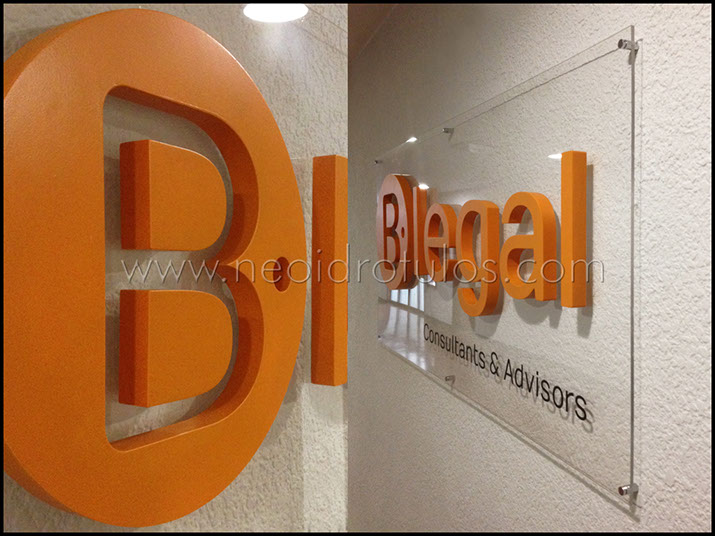 Corpóreas pvc pintadas color corporativo sobre metacrilato incoloro con separadores y embellecedores